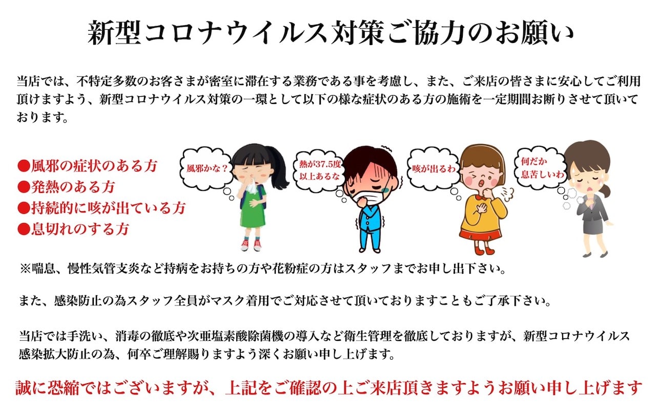 当店ではこのたび、不特定多数のお客様が密室に滞在する業務であることを考慮し、また、ご来店の皆様に安心してご利用頂けますよう、新型コロナウイルス対策の一環として以下の様な症状のある方の施術を一定期間お断りさせて頂いております。