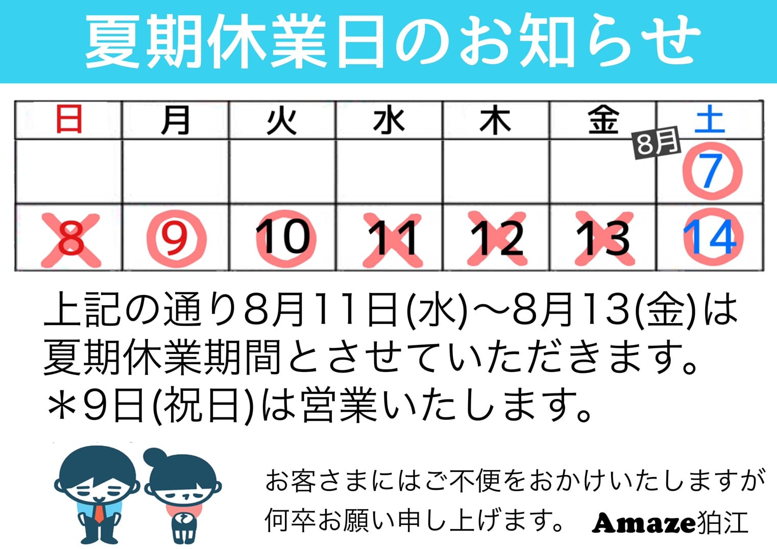 誠に勝手ながらお盆期間の営業日につきまして、下記の通りとさせていただきます。