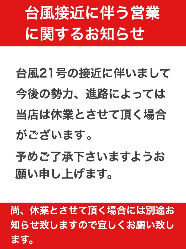大雪警報により、通常より早く閉店させて頂きます。ご迷惑をお掛け致しますが、ご理解賜りますようお願い申し上げます。